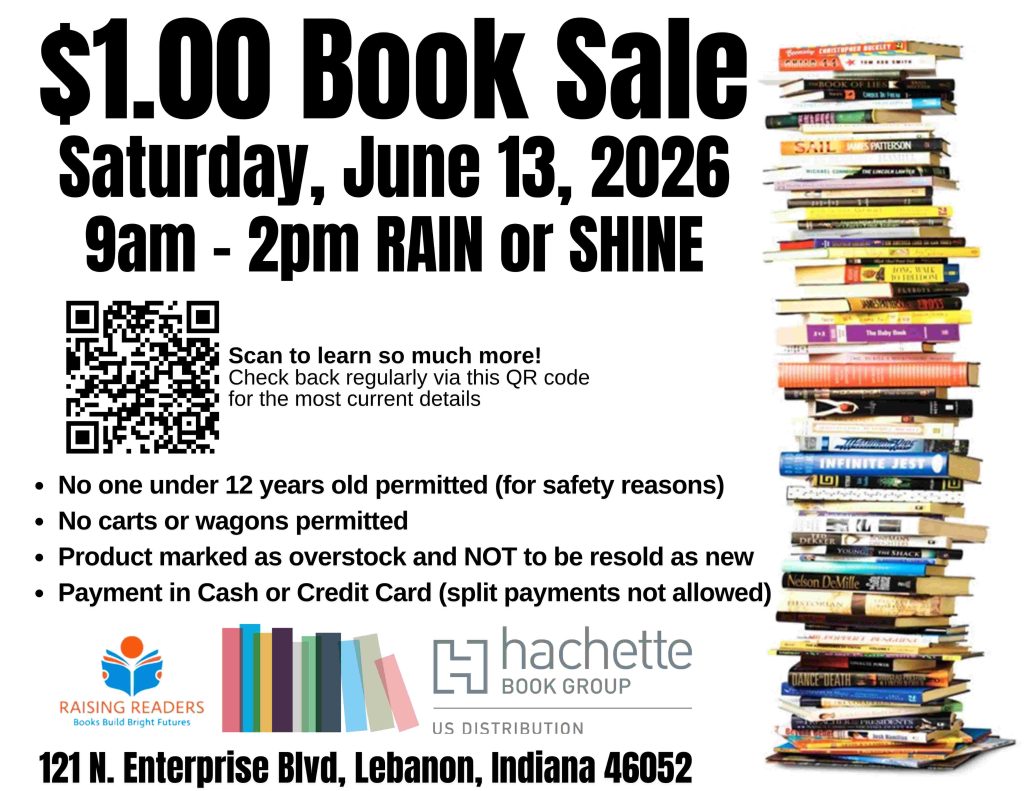 Mark your calendars for June 13th! Our annual $1.00 Book Sale is back! Join us at our Distribution Center in the Lebanon Business Park in Lebanon, Indiana, for a huge selection of titles at an unbeatable price, EVERY BOOK IS ONE DOLLAR! It’s the perfect way to stock your summer reading list while supporting our community literacy initiatives. Doors open at 9:00 AM and close at 2:00 PM. You do not want to miss out on your next favorite read!